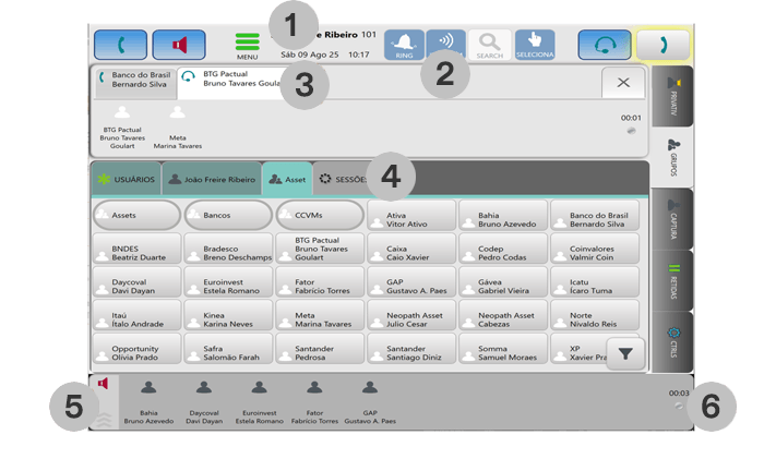 Monitoring Panel for continuous supervision of multiple calls with individual voice-activity indicators, enabling broadcast or multicast communication.